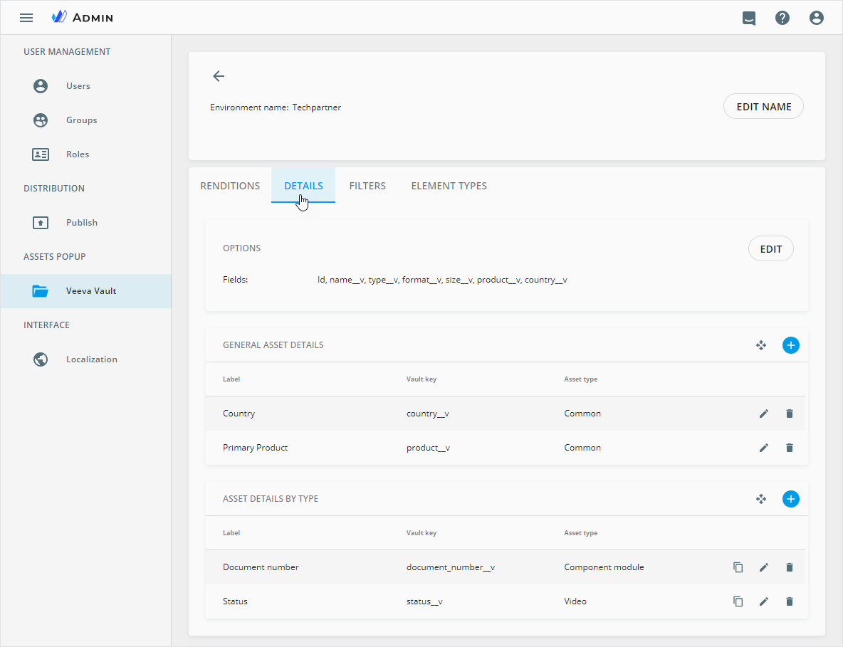 The DETAILS tab allows you to customize the metadata displayed on the DETAILS panel of the Assets popup, as preconfigured by eWizard Support. With these configurations, you can retrieve asset metadata from the specified Veeva Vault PromoMats environment and efficiently locate it in the Assets popup.