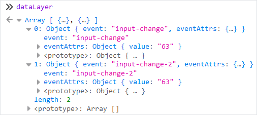 </template>As a result, the data about the name and value change of the input-change and input-change-2 events is sent to the data layer. You can verify it in the browser console.