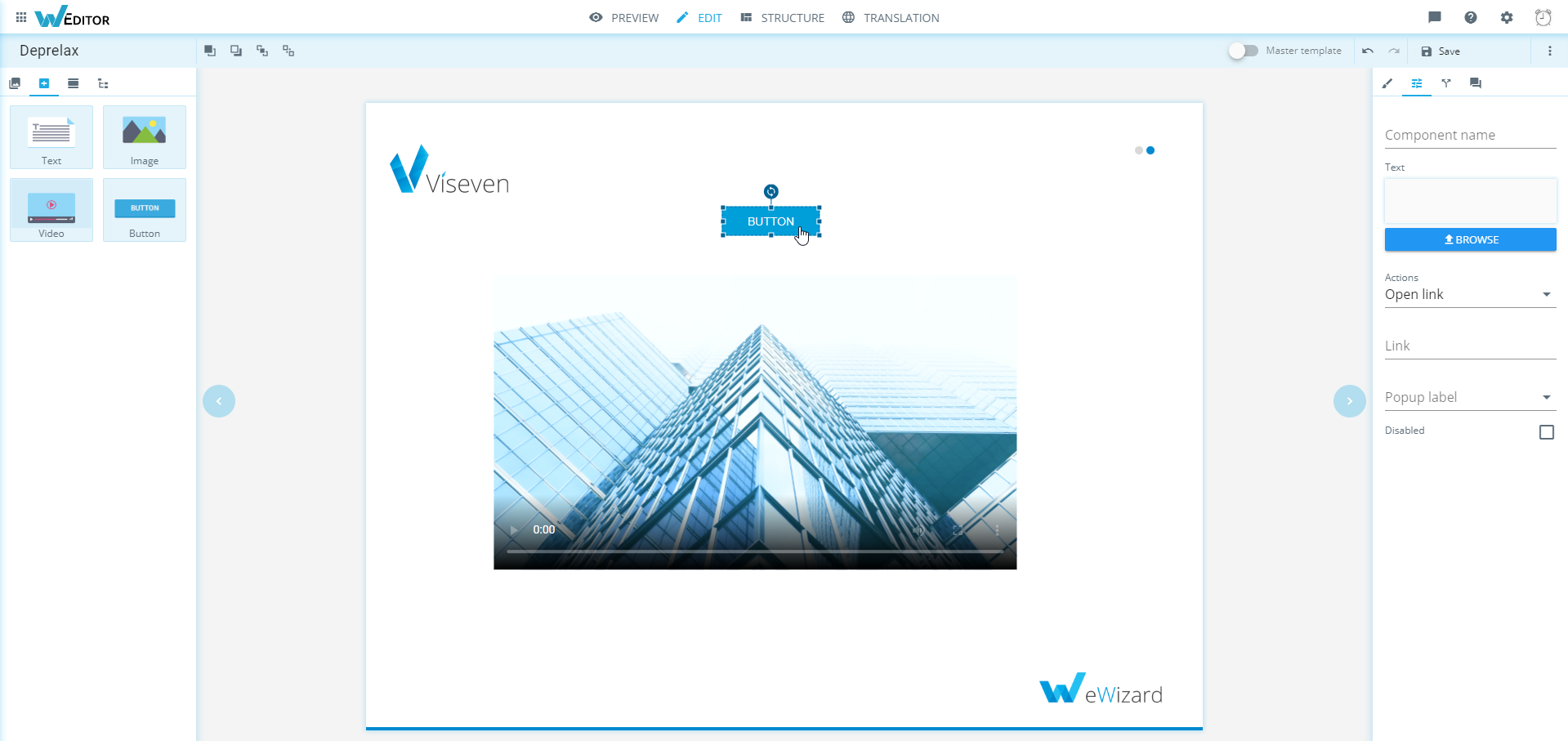 Button enables assigning the open pop-up action with the Actions tab.