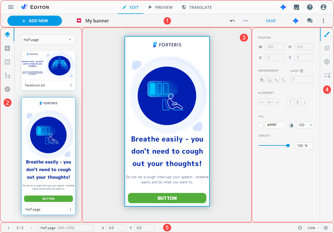 [1] The modes panel to switch between the Editor modes (EDIT, PREVIEW, and TRANSLATE) and a quick access toolbar for banner management in the following ways: