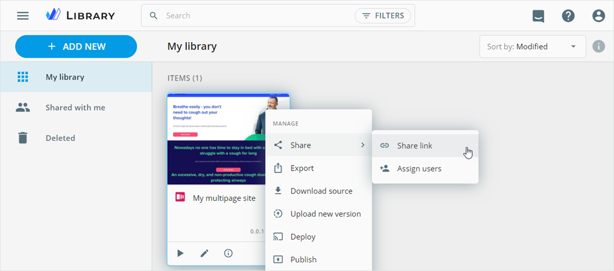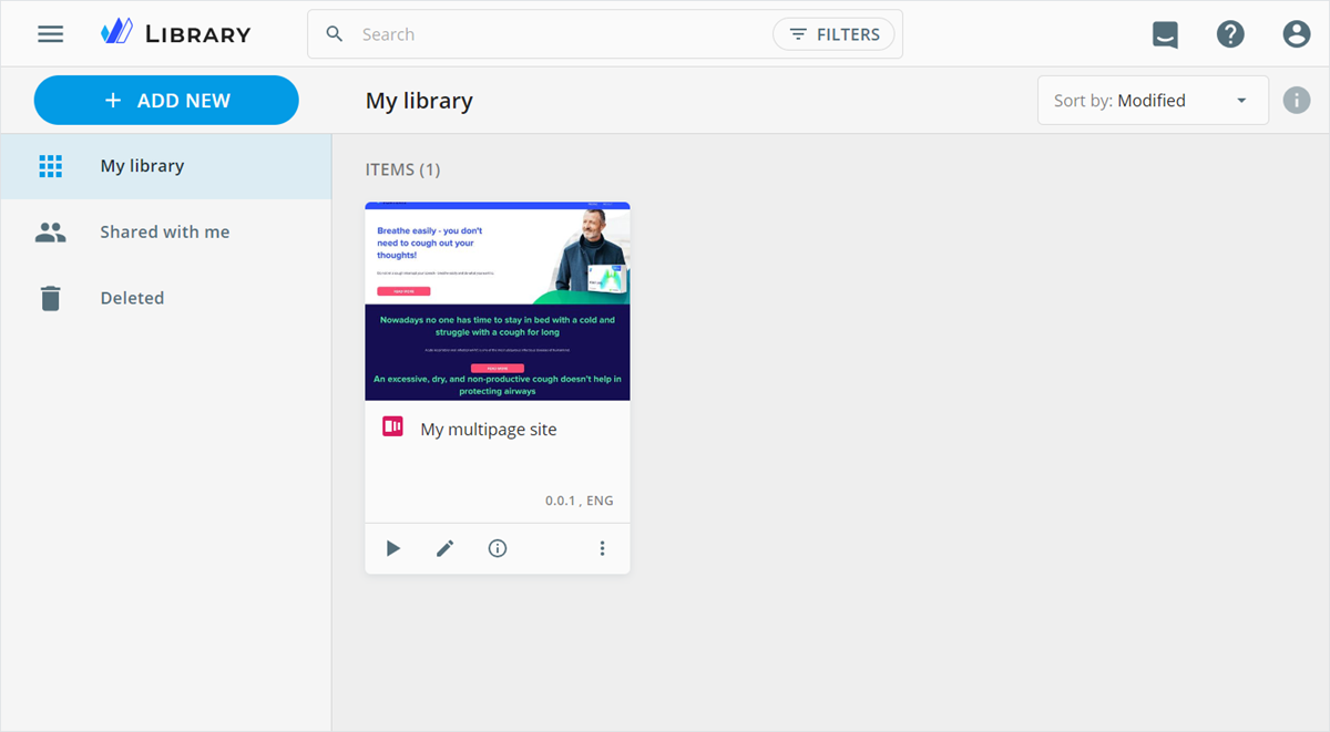 Upon successful creation or upload, your multipage site appears in Library.