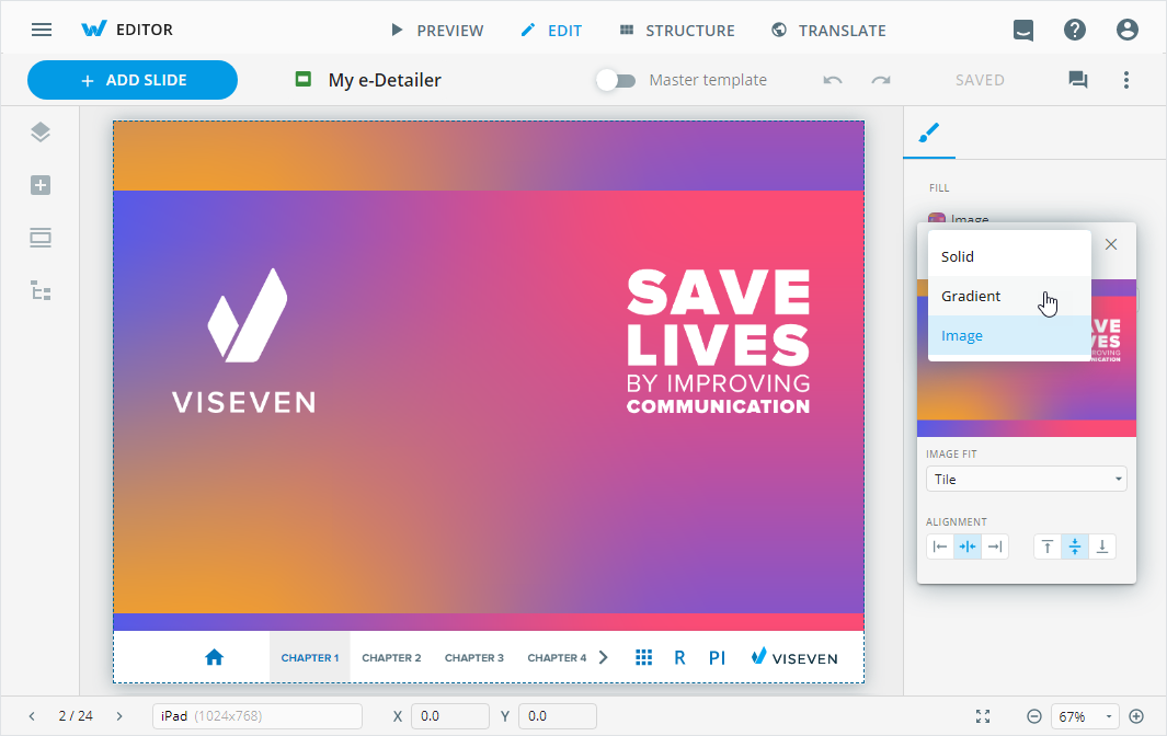 Use the improved color picker to customize the background of slides and components. Select and configure the required background styling: Solid, Gradient, or Image.