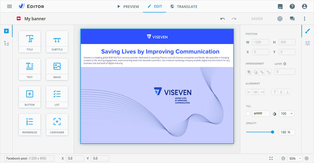 In eWizard Editor, you can customize banners of the required type and size based on the intended use. Deliver a ready-made banner to the target system with the Publisher service. You can also export the banner as PDF and an image in PNG or JPEG format.